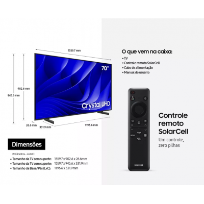 Descubra a revolução visual com a Smart TV 70" Crystal UHD 4K 70DU8000 da Samsung, o ápice da tecnologia de entretenimento em casa. Com o inovador Processador Crystal 4K, cada cena é otimizada para a mais próxima da resolução 4K, garantindo uma experiência de visualização sem precedentes. O 'upscaling' transforma seu conteúdo com uma clareza que redefine os padrões.