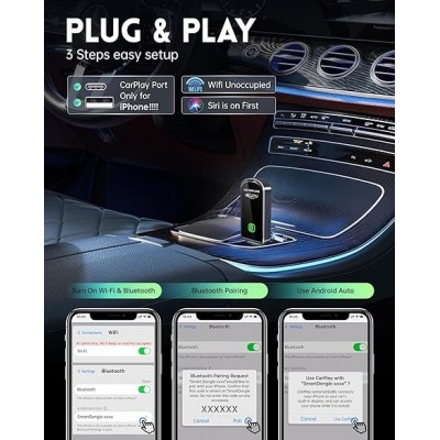 【Plug & Play sem esforço】O adaptador sem fio Apple CarPlay precisa apenas de 3 etapas simples, sem necessidade de unidade extra, aplicativos ou atualizações de sistema problemáticas. Após a primeira conexão, ele se reconectará automaticamente ao seu telefone, mesmo se estiver no seu bolso, mochila ou fora do carro. Torna toda a experiência mais suave, sem ruído e latência zero. Simplifique sua direção!